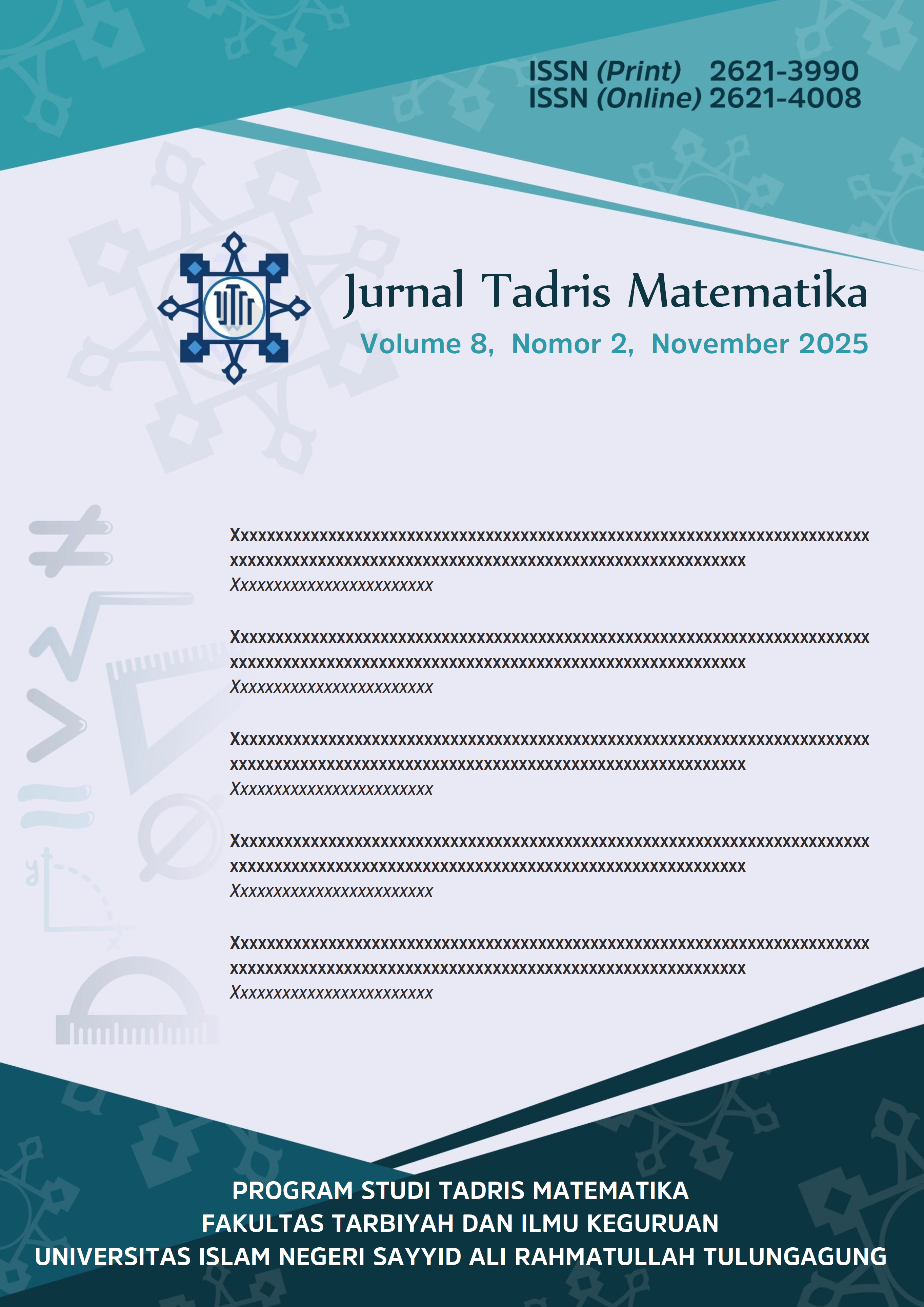 Jurnal Tadris Matematika is a scientific publication in mathematics education and learning including: (1) mathematical thinking process, (2) mathematics models, media, and teaching materials development, (3) pedagogical content knowledge, (4) mathematics theoretical study and learning practice, (5) mathematics learning evaluation, and (6) the integration of mathematics and Islamic value. This journal is published twice a year, June and November.